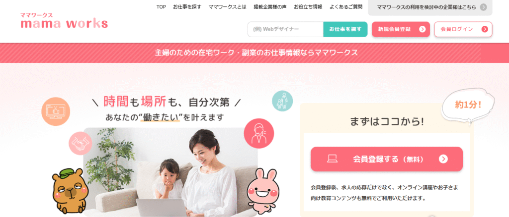 ママワークスは、主婦や育児中の方が自宅で気軽に始められるクラウドソーシングサービスです。1日1000円程度の収入を目指しやすい理由として、細かい条件で仕事を検索でき、短時間でも家事や育児の合間にできる案件が豊富にある点があります。また、パソコンレンタルやインターネット環境のサポートも充実し、初心者でもデータ入力や記事作成などの簡単な仕事から挑戦可能です。さらに、支払い保証や悪質業者対策の通報システムも整っており、在宅ワーク初心者でも安心して稼ぎやすいでしょう。