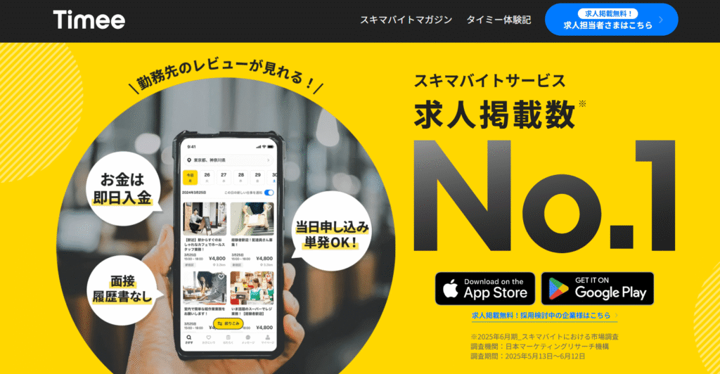 単発の仕事を探せるアプリ「Timee」などを活用すれば、1日だけの仕事にもすぐに応募ができます。