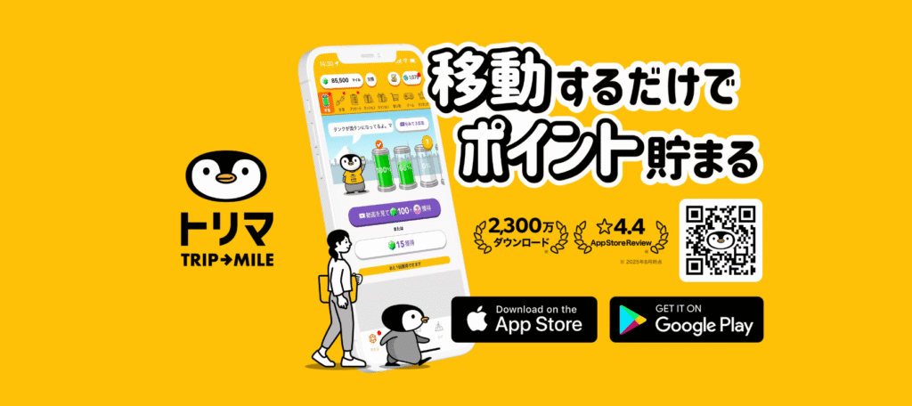 トリマが1日1000円稼ぐポイントサイトとしておすすめな理由は、日常の移動や歩数に応じて自動でマイル(ポイント)が貯まるという手軽さにあります。他のポイントサイトの多くはアンケートや広告閲覧が主流ですが、トリマではスマートフォンを持ち歩くだけで通勤・通学や買い物などの日常的な行動がそのままポイント収入につながる点が大きな強みです。