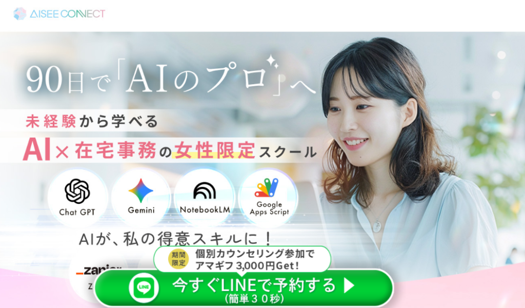 AISEEは、20歳以上の女性を対象に、生成AIを活用したスキルを基礎から学べるオンラインスクールです。