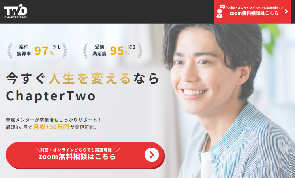 ChapterTwoは、法人営業の現場でも即戦力として活躍できる実践的なスキルを習得できるスクールです。営業の基礎理論はもちろん、法人向けならではの提案手法や商談の組み立て方、契約までのクロージング戦略など、成果につながるノウハウを体系的に学べます。