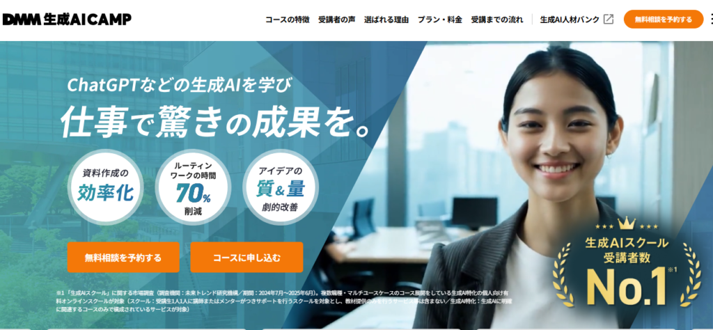 DMM 生成AI CAMPは、受講者数No.1(※)を誇り、目的に応じた3つの学習コースを提供しているオンラインスクールで、自分が求める分野に特化した生成AIスキルを効率的に習得できます。カリキュラムは、基礎知識から実践的な応用まで段階的に構成されており、生成AIの知識が全くない方でも短期間で現場で使えるレベルに到達できるのが特徴です。
