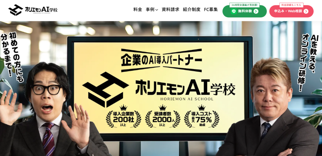 | ホリエモンAI学校 | 初心者向けの講座からビジネスシーンで使う応用講座まで幅広く取り扱っている | なし(法人のみあり) | 162,800円 |