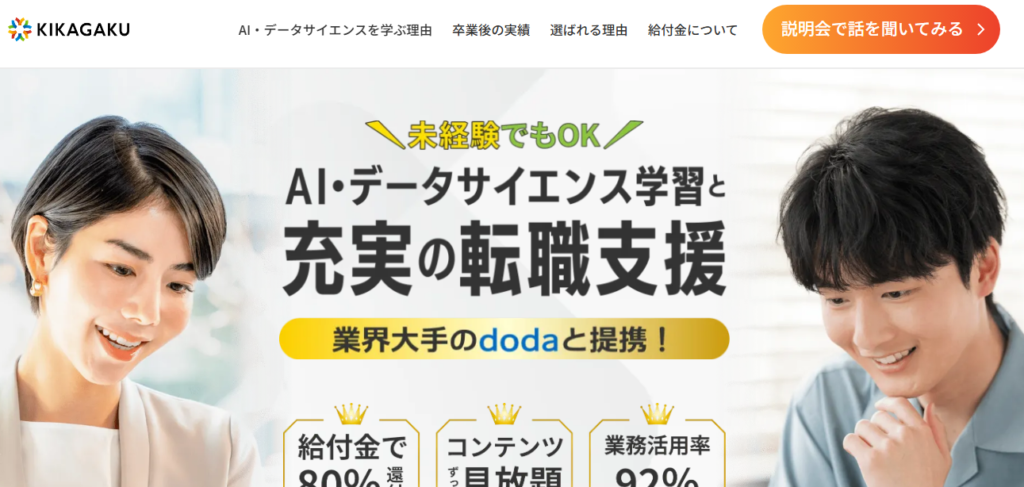 キカガクは、現役のビジネスパーソン向けにAI活用スキルを体系的に学べるスクールです。最大の特徴は、現場経験が豊富な講師陣によるリアルタイム解説や、1対1のメンタリングを通じたきめ細やかな指導です。