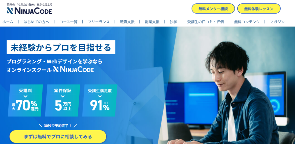 忍者CODEは、プログラミングの基礎知識習得から実践的な課題制作までを一貫して学べるプロジェクト型カリキュラムを採用しているスクールです。学習の初期段階ではHTMLやCSS、JavaScriptなどの基礎スキルを体系的に習得し、その後は実際の案件を想定した課題制作に取り組むことで、即戦力として活躍できる力を身につけられます。