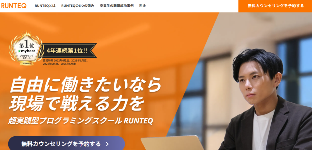 RUNTEQは、国内プログラミングスクールランキングで4年連続1位を獲得している高評価のスクールです。