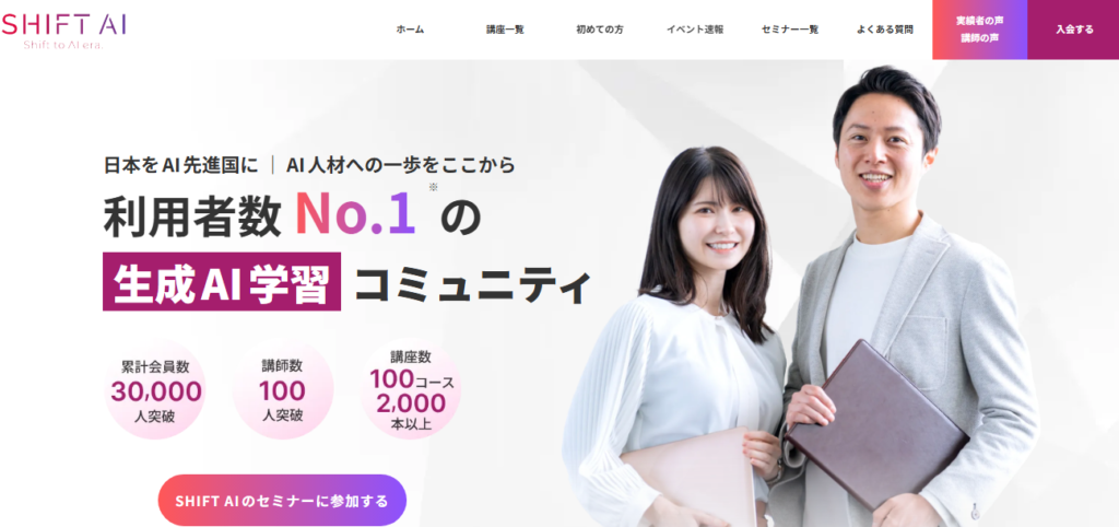 SHIFT AIは、会員数20,000名以上、講師数100名以上を誇る国内最大級の生成AI学習コミュニティです。最新の生成AIツールの活用法や実践的なスキルを学べる1,000本以上の動画教材を提供しており、初心者から上級者まで幅広く対応しています。