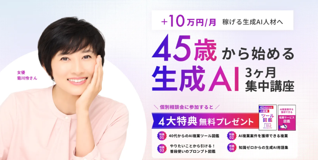 ライフシフトラボは、40代〜60代のミドル・シニア層に向けて設計された生成AI講座を提供しています。AIの基礎知識から実践的な活用法までを短期間で習得できるカリキュラムを用意し、特に「稼げるようになること」を最優先に据えているのが特徴です。