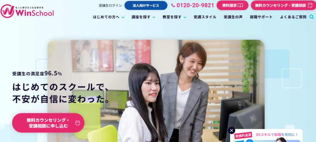 | Winスクール | 資料作成やデータ分析など、業務シーンで即活躍できるスキルを学べるスクール | あり | 38,500円~ |
