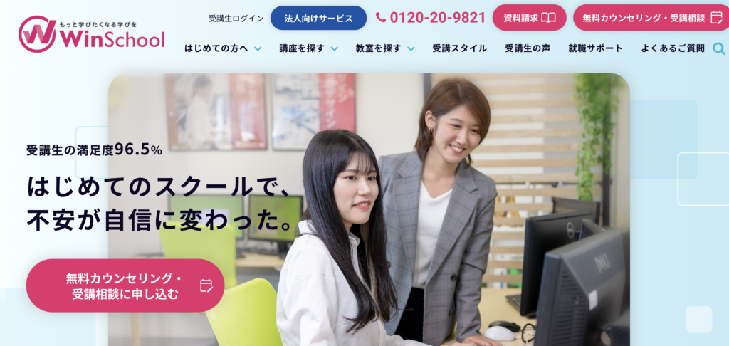 Winスクールは、全国に教室を展開する実践重視型のIT・ビジネス系スクールで、DX・プログラミング・グラフィックデザイン・CADなど300以上の講座を提供しています。初心者から経験者まで幅広く対応しており、受講者一人ひとりの目的やスキルレベルに応じた個別カリキュラムの提案と丁寧なサポートが特長です。