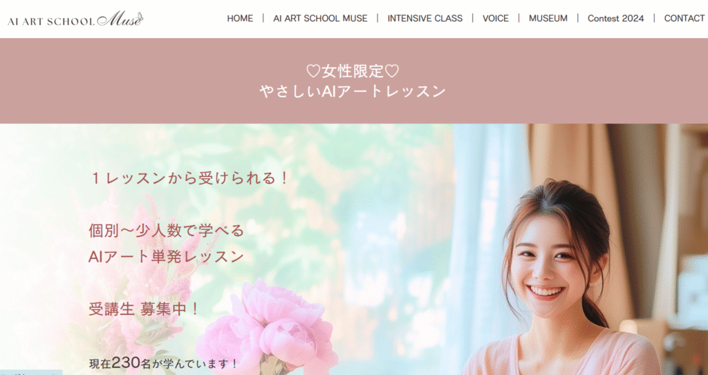 AIアートスクールMuseは、女性限定・初心者歓迎のAIイラスト&デジタルアート特化型オンラインスクールです。MidjourneyやStable Diffusionなどの画像生成AIを活用し、自分だけの世界観を表現するアート作品を制作できるスキルを、基礎から丁寧に学ぶことができます。