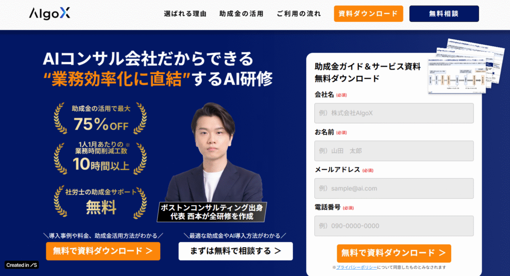 AlgoX(アルゴエックス)は、法人向けに特化したAIリスキリング研修サービスを提供するスクールで、特に業務効率化や生成AI活用を推進したい企業向けに設計された内容が特徴です。AI×業務改善の専門家が講師を務め、実務に即した視点からChatGPTや画像生成AIの活用法をわかりやすくレクチャーします。