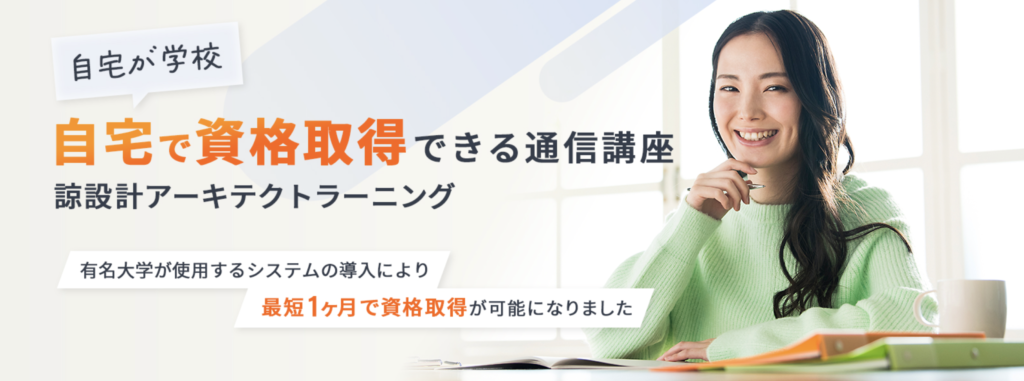 諒設計アーキテクトラーニングは、在宅で資格を取得したい方や、未経験から専門知識を身につけてキャリアの幅を広げたい方に人気の通信講座です。