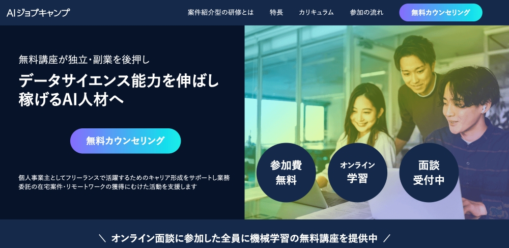 AIジョブキャンプは、社会人向けのAI教育講座を提供するオンラインスクールです。