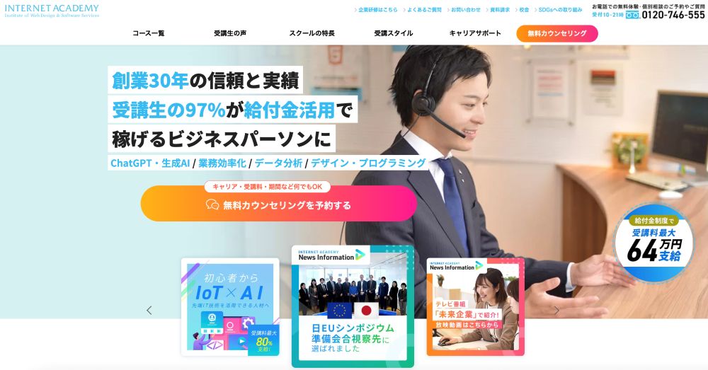INTERNET ACADEMYは、リモート集合研修・実地研修・講師派遣・eラーニングなど、目的や環境に合わせて学習スタイルを選べるスクールです。