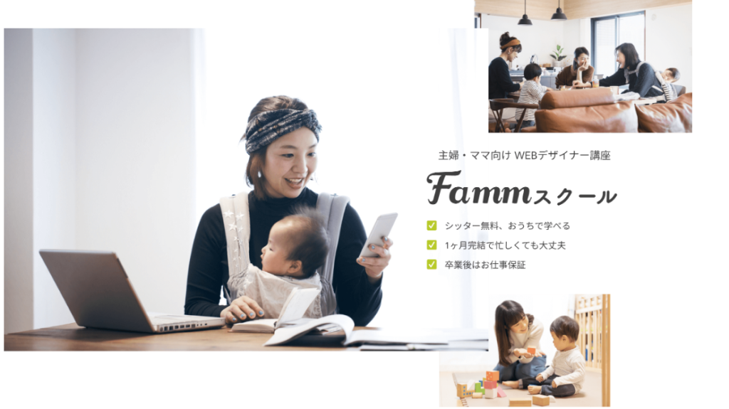 子育て中のママに特化したオンラインスクールとして人気を集めているのが Fammです。完全在宅で受講できるため、移動時間を気にせず家事や育児の合間に学習を進められるのが大きな特徴です。