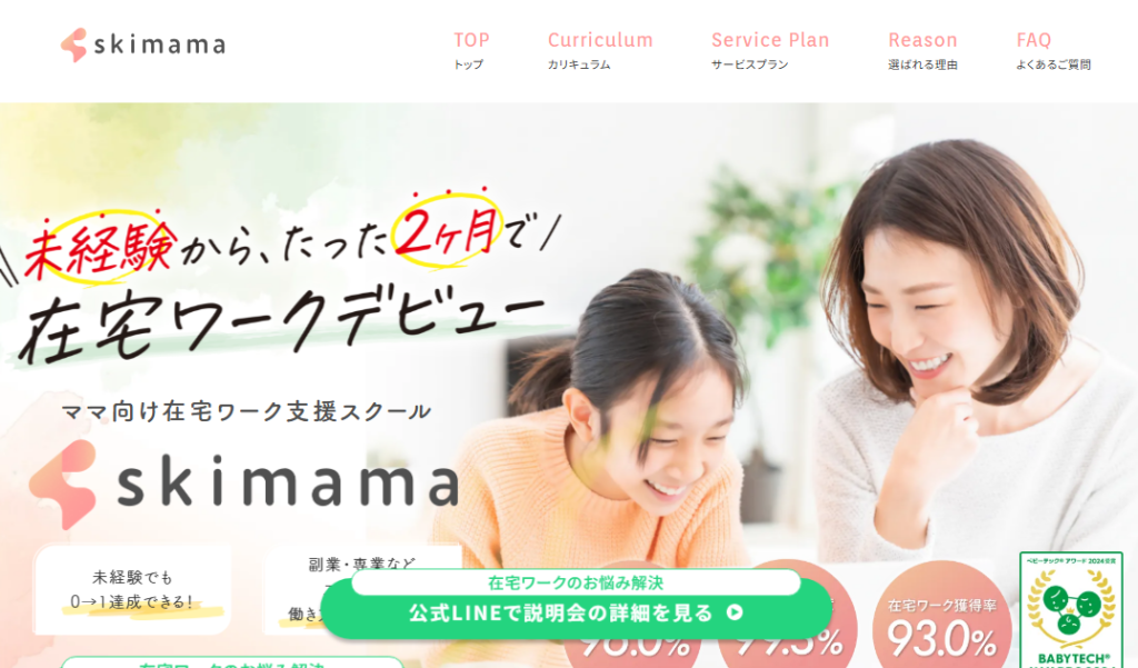 家庭や育児と両立しながら新しいキャリアを築きたい主婦・ママに特化した学習サービスがskimamaです。同じ立場の仲間と励まし合えるコミュニティがあり、学習に不安を抱える初心者でも安心して取り組めるきめ細やかなサポート体制が整っています。