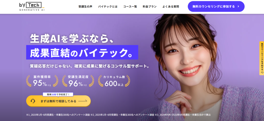 by Tech(バイテック)は、生成AIという今後のビジネス現場で需要が高まる分野を学べる点で、育休中のリスキリングと相性が良いサービスです。
