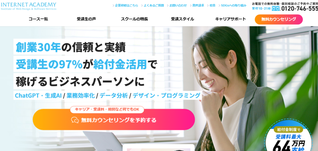 また、厚生労働省や経済産業省の給付金対象スクールであり、最大64万円の給付金が受け取れる点も魅力のひとつです。