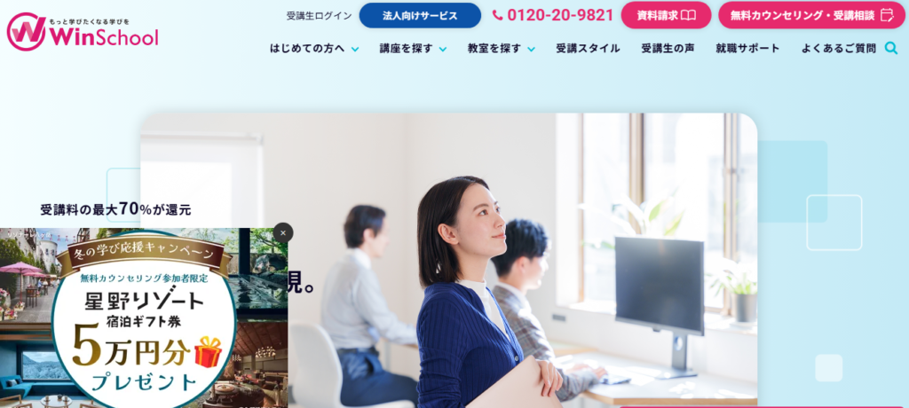 Winスクール年間約3,000人の資格取得実績があり、就職率96%を公表しているIT学習スクールです。