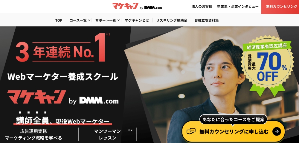「マケキャンbyDMM.com」は、実践的なWebマーケティングを学べるスクールです。
