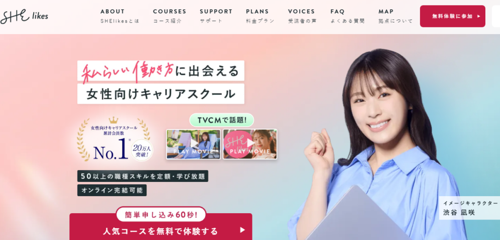 SHElikes(シーライクス)は、女性やママを対象としたコミュニティ型のオンラインスクールで、Webデザインやライティング、Webマーケティングなど、50以上の職種スキルを学ぶことができます。